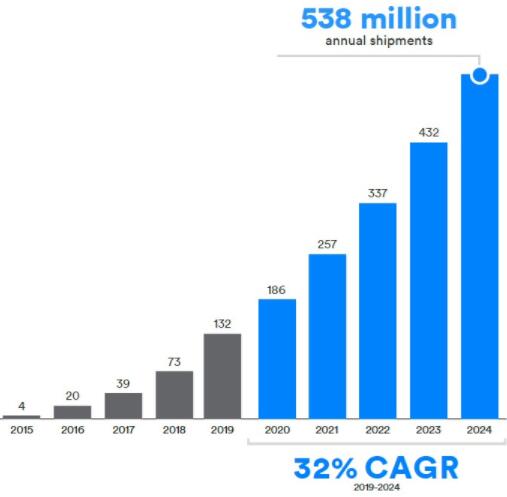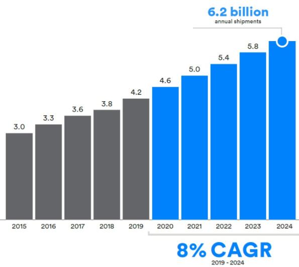 ● 音頻流應(yīng)用包括:語音通話、收聽音頻/音樂、視聽設(shè)備、智能語音控制。2019-2024年增長率為7%,到2024年出貨量將達15.4億個。