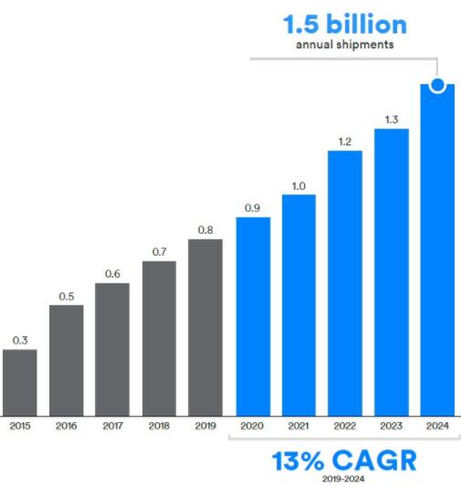 ● 數(shù)據(jù)傳輸應(yīng)用包括:運動健身體征數(shù)據(jù)測量、醫(yī)療保健、輸入和控制、物聯(lián)網(wǎng)等。2019-2024年增長率為13%,到2024年出貨量將達15億個。