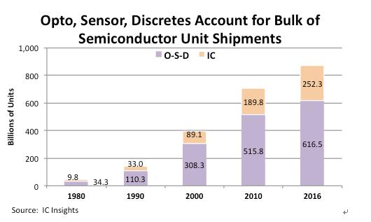 雖然集成電路技術(shù)不斷發(fā)展,越來(lái)越多的功能被集成到一顆存儲(chǔ)芯片中,從而以系統(tǒng)的角度來(lái)看用到的芯片數(shù)量越來(lái)越少,但I(xiàn)C Insights的統(tǒng)計(jì)結(jié)果顯示,全球半導(dǎo)體出貨量中,集成電路占比依然很低,而光電器件、傳感器與分立器件(Opto-Sensor-Discrete,簡(jiǎn)稱(chēng)O-S-D)的比重仍然超過(guò)七成。