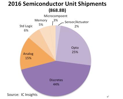 在2016年集成電路出貨量中,占比最高的是模擬集成電路,模擬集成電路占集成電路整體出貨量的52%,半導(dǎo)體整體出貨量的15%,下圖列出了2016年不同類(lèi)別半導(dǎo)體出貨量的比例。