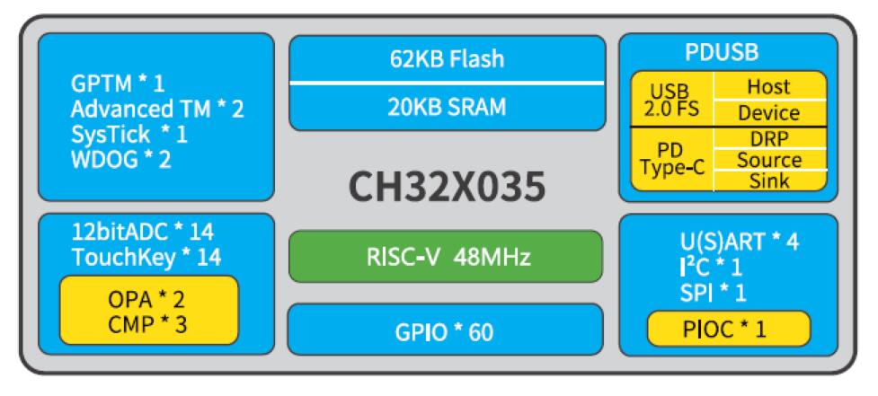 CH32X035系列是基于青稞V4C內(nèi)核設(shè)計(jì)的工業(yè)級(jí)微控制器。內(nèi)置USB和PD PHY,支持USB Host主機(jī)和USBDevice設(shè)備功能、PDUSB及Type-C快充功能,內(nèi)置可編程協(xié)議I/O控制器,提供OPA運(yùn)放、CMP電壓比較器、USART串口、/2C、SPI、定時(shí)器、12位ADC、Touchkey等豐富外設(shè)資源。