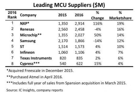 隨著物聯(lián)網(wǎng)領(lǐng)域應(yīng)用對(duì)MCU需求的進(jìn)一步增長(zhǎng)。為了搶占市場(chǎng)份額,供應(yīng)商們進(jìn)行了多次的并購(gòu),并最終改變了MCU的供應(yīng)商排名。根據(jù)IC Insights的統(tǒng)計(jì),全球最大的MCU供應(yīng)商由收購(gòu)了Freescale的NXP擔(dān)當(dāng),而Microchip、Cypress也通過(guò)收購(gòu),提高營(yíng)收,擴(kuò)大了在MCU市場(chǎng)的份額。但因?yàn)樵?016年,MCU的增長(zhǎng)并沒(méi)有那么明顯,那就沒(méi)有更多的收購(gòu)事件發(fā)生。
