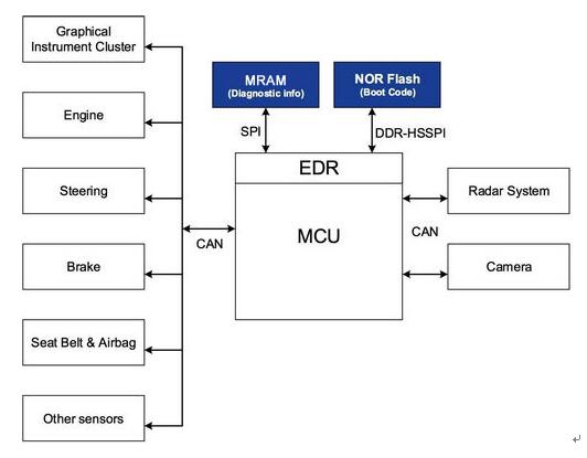 EDR 通過(guò)測(cè)量汽車前部壓力傳感器的撞擊力、車速、發(fā)動(dòng)機(jī)轉(zhuǎn)速、轉(zhuǎn)向輸入、油門(mén)位置、制動(dòng)狀態(tài)、安全帶狀態(tài)(檢測(cè)乘客)、輪胎氣壓、警告信號(hào)以及安全氣囊打開(kāi)狀態(tài),從而判斷碰撞嚴(yán)重程度。并且在汽車碰撞前和碰撞期間記錄以上數(shù)據(jù)。顯然,微控制器不能等到事故發(fā)生才開(kāi)始記錄數(shù)據(jù)。因此,微控制器需要連續(xù)存儲(chǔ)數(shù)據(jù)。所以,EDR 需要一個(gè)具有幾乎無(wú)限寫(xiě)次數(shù)的非易失性存儲(chǔ)器。