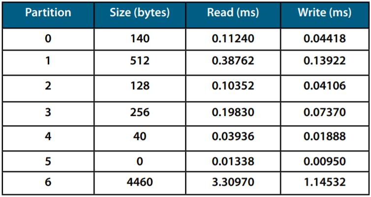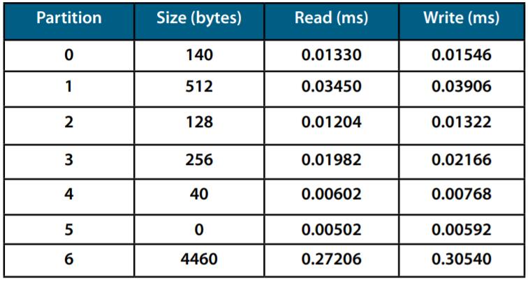 MRAM低級(jí)驅(qū)動(dòng)程序通過(guò)操作系統(tǒng)和調(diào)度程序集成到動(dòng)力總成應(yīng)用程序中。讀寫(xiě)周期由系統(tǒng)時(shí)鐘(300MHz)測(cè)量。圖1&2顯示了針對(duì)動(dòng)力總成應(yīng)用的具有不同非易失性存儲(chǔ)器接口的每個(gè)分區(qū)的讀/寫(xiě)時(shí)間。這些表顯示大多數(shù)讀/寫(xiě)周期小于2ms。毫不奇怪,該表確認(rèn)35ns并行接口以比40MHz