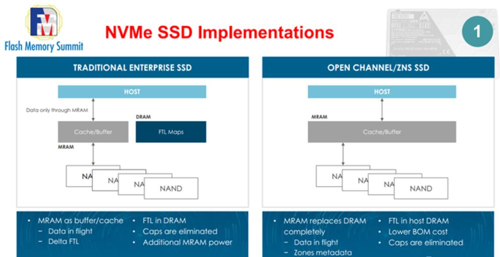 采用MRAM之后,NVMe SSD內(nèi)部的架構(gòu)發(fā)生了以下圖片的變化,將MRAM作為數(shù)據(jù)緩存使用,而FTL映射表存儲(chǔ)依然是DRAM:
