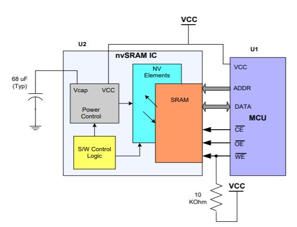 高速SRAM單元提供了非常高速的讀寫訪問,并且可以像標(biāo)準(zhǔn)SRAM中一樣無限次地寫入或讀取NV-SRAM。如果斷電則利用存儲(chǔ)在與NV-SRAM的VCAP引腳相連的小電容器中的電荷將SRAM中保存的數(shù)據(jù)傳輸?shù)脚c每個(gè)SRAM單元集成的非易失性元件。 NV-SRAM VCAP引腳上需要的電容器只有幾十µF,典型值為68 µF(有關(guān)VCAP的允許范圍,并在上電期間通過內(nèi)部充電電路進(jìn)行充電。 VCAP上存儲(chǔ)的電荷足以在掉電期間將SRAM數(shù)據(jù)復(fù)制到非易失性元件(稱為存儲(chǔ)操作)。