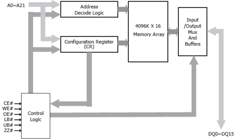 pSRAM,使用DRAM型存儲器單元,但該器件具有無刷新操作和極端低功耗技術。接口與低功耗異步類型SRAM兼容。該設備組織為4,194,304字x16位。