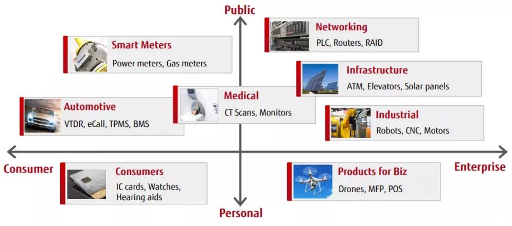 經(jīng)過(guò)市場(chǎng)的長(zhǎng)期廣泛驗(yàn)證以及技術(shù)的不斷突破,富士通FRAM產(chǎn)品已成功應(yīng)用于智能卡及IC卡等卡片領(lǐng)域、電力儀表及產(chǎn)業(yè)設(shè)備等工業(yè)領(lǐng)域,醫(yī)療設(shè)備及醫(yī)療RFID標(biāo)簽等醫(yī)療領(lǐng)域、胎壓監(jiān)測(cè)及新能源汽車電池管理系統(tǒng)等汽車領(lǐng)域等等,涉及的應(yīng)用超過(guò)200種,幾乎覆蓋所有主要領(lǐng)域!