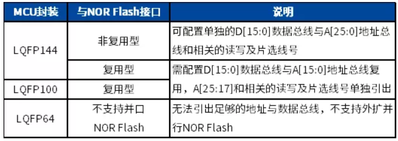 MM32F3270系列MCU因為封裝的原因,導致只有部分MCU產(chǎn)品可以通過硬件復用出全部或部分的FSMC接口的相關(guān)GPIO;外擴NOR Flash也只有使用 LQFP144引腳封裝MCU芯片才能支持連接地址數(shù)據(jù)非復用和復用方式外擴并行NOR Flash;而LQFP100引腳封裝芯片因地址線縮減,僅支持連接地址數(shù)據(jù)復用方式外擴并行NOR Flash。LQFP64因為無法引出足夠的地址與數(shù)據(jù)總線,同樣不支持外擴并行NOR Flash。目前市場上非復用型16位數(shù)據(jù)總線接口的NOR Flash也是較為普遍。