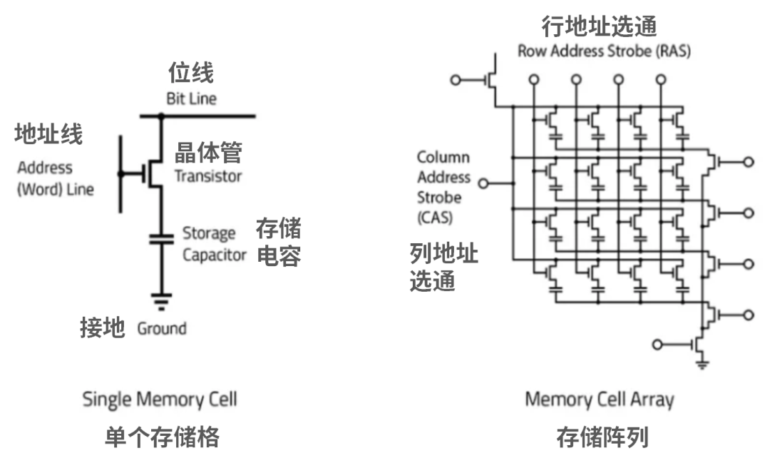 DRAM由許多重復(fù)的位元格組成,每一個(gè)基本單元由一個(gè)電容和一個(gè)晶體管構(gòu)成。電容中存儲(chǔ)電荷量的多寡,用于表示“0”和“1”。而晶體管,則用來(lái)控制電容的充放電。