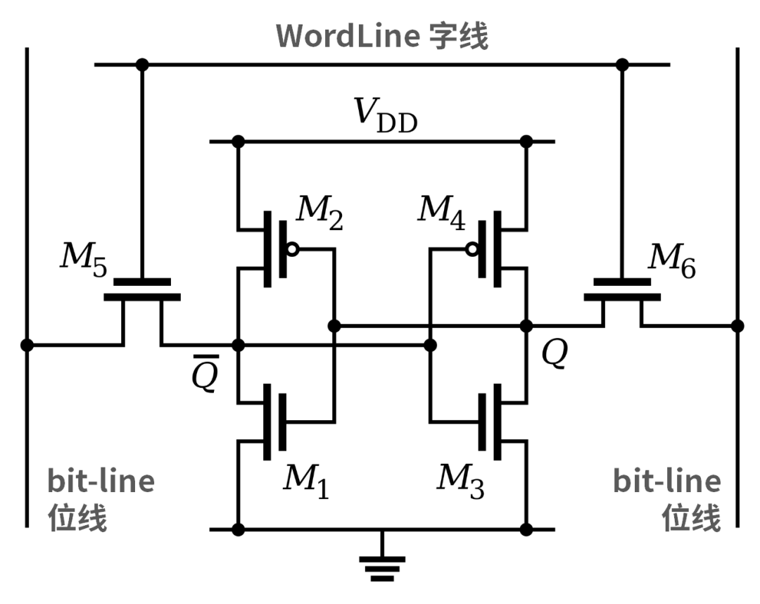 SRAM的基本單元,則最少由6管晶體管組成:4個(gè)場(chǎng)效應(yīng)管(M1,M2,M3,M4)構(gòu)成兩個(gè)交叉耦合的反相器,2個(gè)場(chǎng)效應(yīng)管(M5,M6)用于讀寫(xiě)的位線(BitLine)的控制開(kāi)關(guān),通過(guò)這些場(chǎng)效應(yīng)管構(gòu)成一個(gè)鎖存器(觸發(fā)器),并在通電時(shí)鎖住二進(jìn)制數(shù)0和1。因此,SRAM被稱為“靜態(tài)隨機(jī)存儲(chǔ)器”。