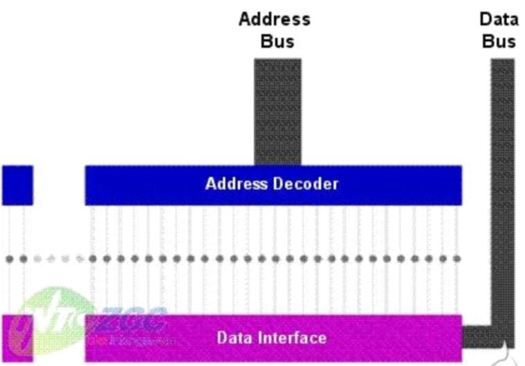 上圖中的小圓點(diǎn)代表RAM中的存儲空間,每一個都有一個唯一的地址線同它相連。當(dāng)?shù)刂方獯a器接收到地址總線傳送來的地址數(shù)據(jù)之后,它會根據(jù)這個數(shù)據(jù)定位中央處理器想要調(diào)用的數(shù)據(jù)所在的位置,然后數(shù)據(jù)總線就會把其中的數(shù)據(jù)傳送到中央處理器。