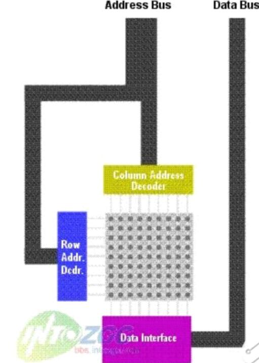 如果RAM對于CPU來說僅僅是一條“線”的話,還不能體現(xiàn)實(shí)際的運(yùn)行情況。因?yàn)槿绻麑?shí)際情況真的是如此的話,在實(shí)際制造芯片的時候,會有很多實(shí)際的困難,特別是在需要設(shè)計(jì)大容量的RAM的時候。所以一種更好的能夠降低成本的方法是讓存儲信息的“空格”排列為很多行--每個“空格”對應(yīng)一個bit存儲的位置。如果要存儲1024bits(2^10)數(shù)據(jù),那么你只要使用32x32(2^5*2^5=2^10)的矩陣就能夠達(dá)到這個目的了。很明顯一個32x32的矩陣比一個1024bit的行設(shè)備更緊湊,實(shí)現(xiàn)起來也更加容易。請看圖2.