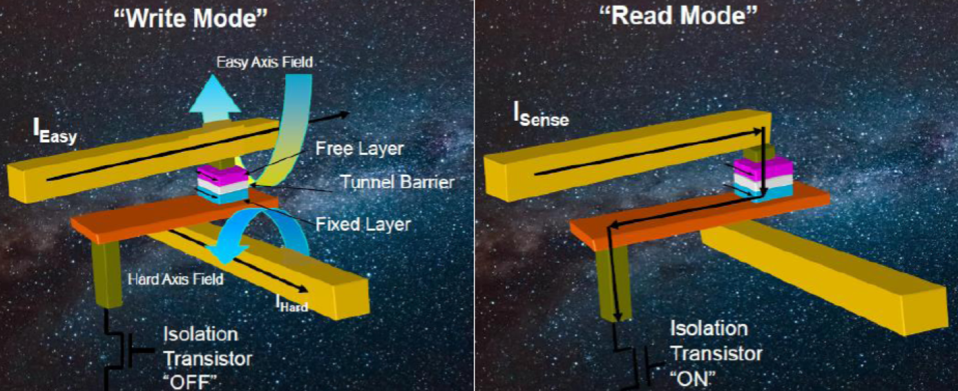 MRAM或磁性隨機(jī)存取存儲(chǔ)器使用具有鐵磁性材料的磁性“狀態(tài)”的1晶體管–1磁性隧道結(jié)(1T-1MTJ)體系結(jié)構(gòu)作為數(shù)據(jù)存儲(chǔ)元素。由于MRAM使用磁性狀態(tài)進(jìn)行存儲(chǔ)(而不是隨時(shí)間推移而“泄漏”的電荷),因此MRAM提供了相當(dāng)長(zhǎng)的數(shù)據(jù)保留時(shí)間(+20年)和無(wú)限的耐用性。切換磁極化(寫(xiě)入周期)是在電磁隧道結(jié)(MTJ)上方和下方的導(dǎo)線中產(chǎn)生脈沖電流的結(jié)果(見(jiàn)圖1)。電流脈沖產(chǎn)生的相關(guān)H場(chǎng)改變了鐵磁材料自由層的極化,這種磁開(kāi)關(guān)不需要原子或電子的位移,這意味著沒(méi)有與MRAM相關(guān)的磨損機(jī)制。自由層相對(duì)于固定層的磁矩改變了MTJ的阻抗(見(jiàn)圖2)。阻抗的這種變化表示數(shù)據(jù)的狀態(tài)(“1”或“0”)。通過(guò)測(cè)量MTJ的阻抗來(lái)實(shí)現(xiàn)傳感(讀取周期)(圖3)。MRAM器件中的讀取周期是非破壞性的,并且相對(duì)較快(35ns)。讀取操作是通過(guò)在MTJ兩端施加非常低的電壓來(lái)完成的,從而在部件壽命內(nèi)支持無(wú)限的操作。